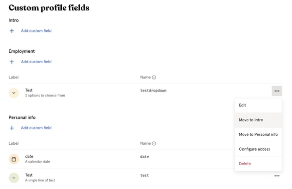 - Click "Add custom field" below either Intro, Employment or Personal info. What you choose decides where on a user profile the field will be.