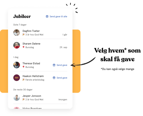When your people has a birthday or other anniversary, we show a gift icon for them. When you click the gift icon, we send the employee’s name, email, and phone number to Glede, and open a form so you can select the details for the gift card. Just a few clicks later, the lucky employee receives an SMS or email that takes them to a fun gift experience and a well-deserved recognition.
