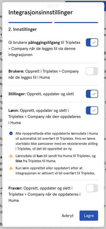 - Stillingsdata vil kun sendes fra Huma til Tripletex, og ikke fra Tripletex til Huma.