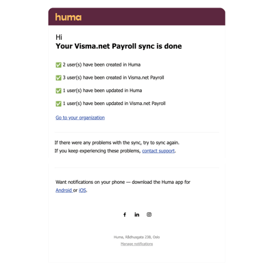- Huma will now start synchronizing users with Visma.net Payroll. You will receive an email confirming the result.