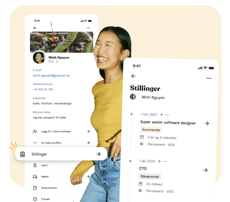 Enkelt å finne relevant informasjon om kollegaers kostbehov, nødkontakter, personalia, lønn, og mer. Hjelp folka dine å kjenne hverandre og holde kontakten.