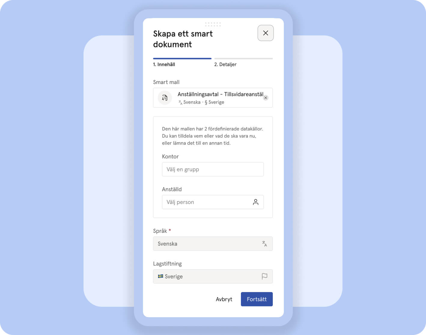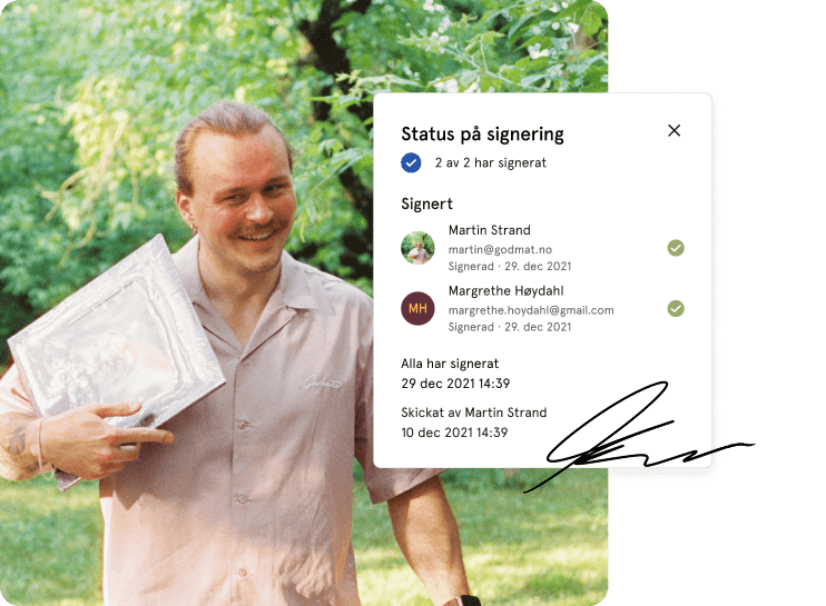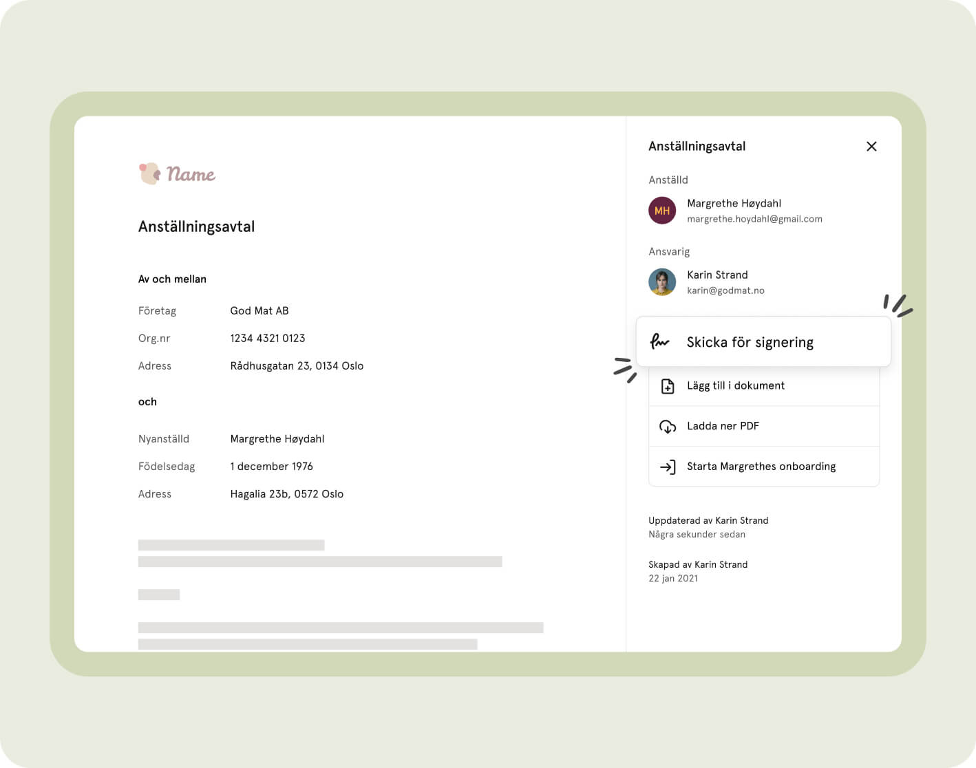 När du skapar anställningsavtal finns det många lagar och regler du måste följa. Vi har tagit hjälp av bland annat advokaterna på Schjødt så att du inte behöver tänka på det. Med digitala och skräddarsydda anställningsavtal lagrade på ett ställe blir allt som rör avtalet enklare. Du kan spara dem som mallar och när du anställer någon fyller du bara i de tomma fälten. När det är klart, skicka det till en ny medarbetare som signerar digitalt – så är jobbet gjort!